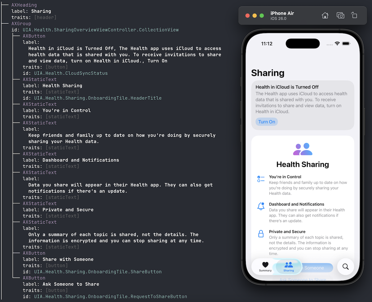 Point it at a running simulator app and get a structured view of your UI’s accessibility properties - roles, labels, values, traits, hints, and identifiers. Output comes in either a color-coded tree view or JSON format.